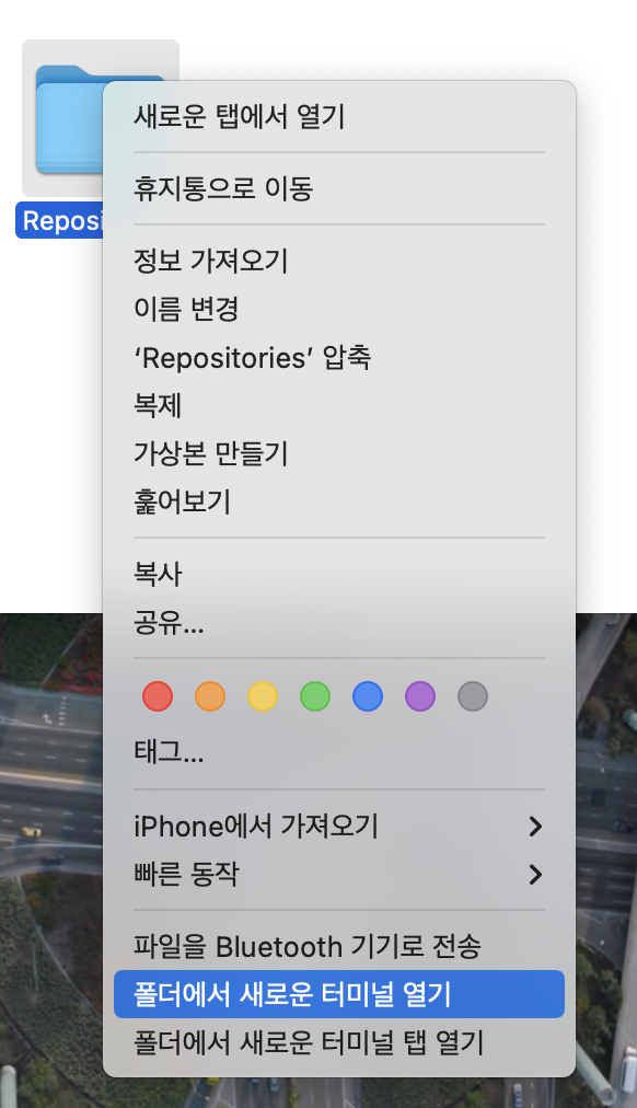 Windows에서는 디렉토리에 대해 우클릭 후 현재 디렉토리를 터미널로 실행하는 기능이 있었는데, 맥에서는 이 점을 찾기 힘들어서 해당 부분을 찾아보았습니다.