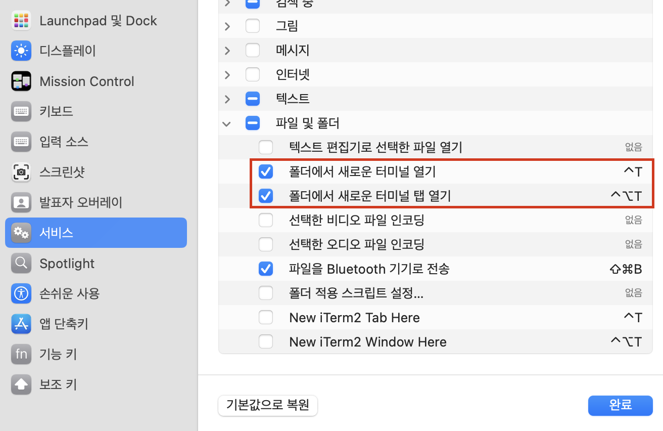 서비스 → 파일 및 폴더 → 폴더에서 새로운 터미널 열기, 폴더에서 새로운 터미널 탭 열기 가 비활성화 되어있다면 체크 표시를 눌러 활성화 해 줍니다.