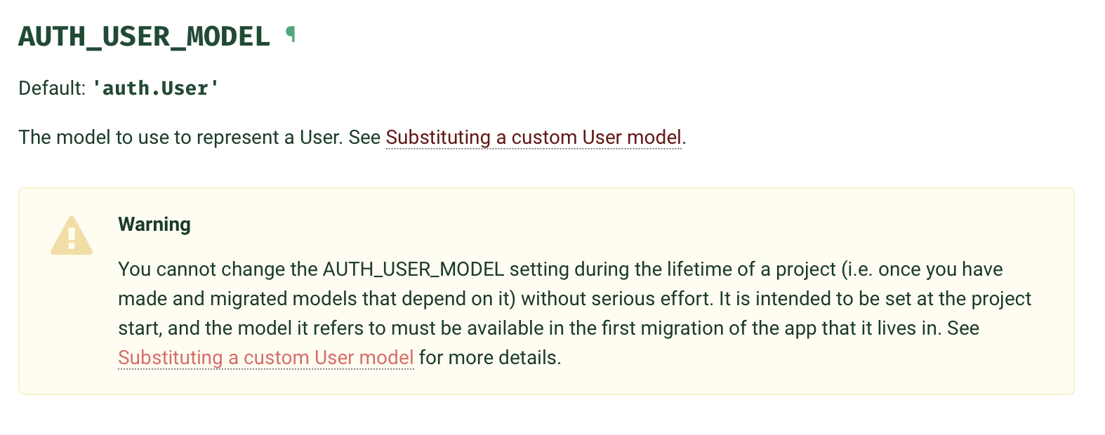 아래 그림은 Django 공식문서에서 제공되는 AUTH_USER_MODEL에 대한 설명입니다. 프로젝트 시작 후에 해당 값을 변경하지 말라고 하네요.