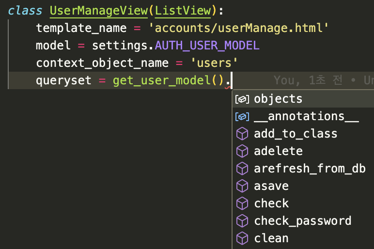 메서드 접근은 AUTH_USER_MODEL또한 가능하긴 하나, get_user_model()을 사용할 경우 IDE에서 자동완성을 지원하기 때문에 편의성이 높아집니다.
